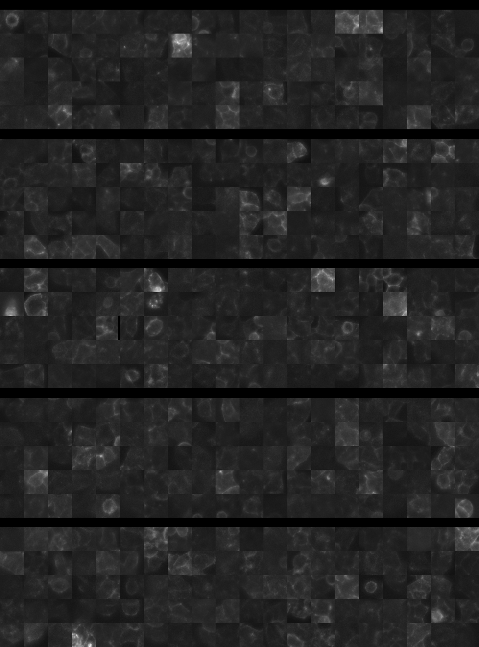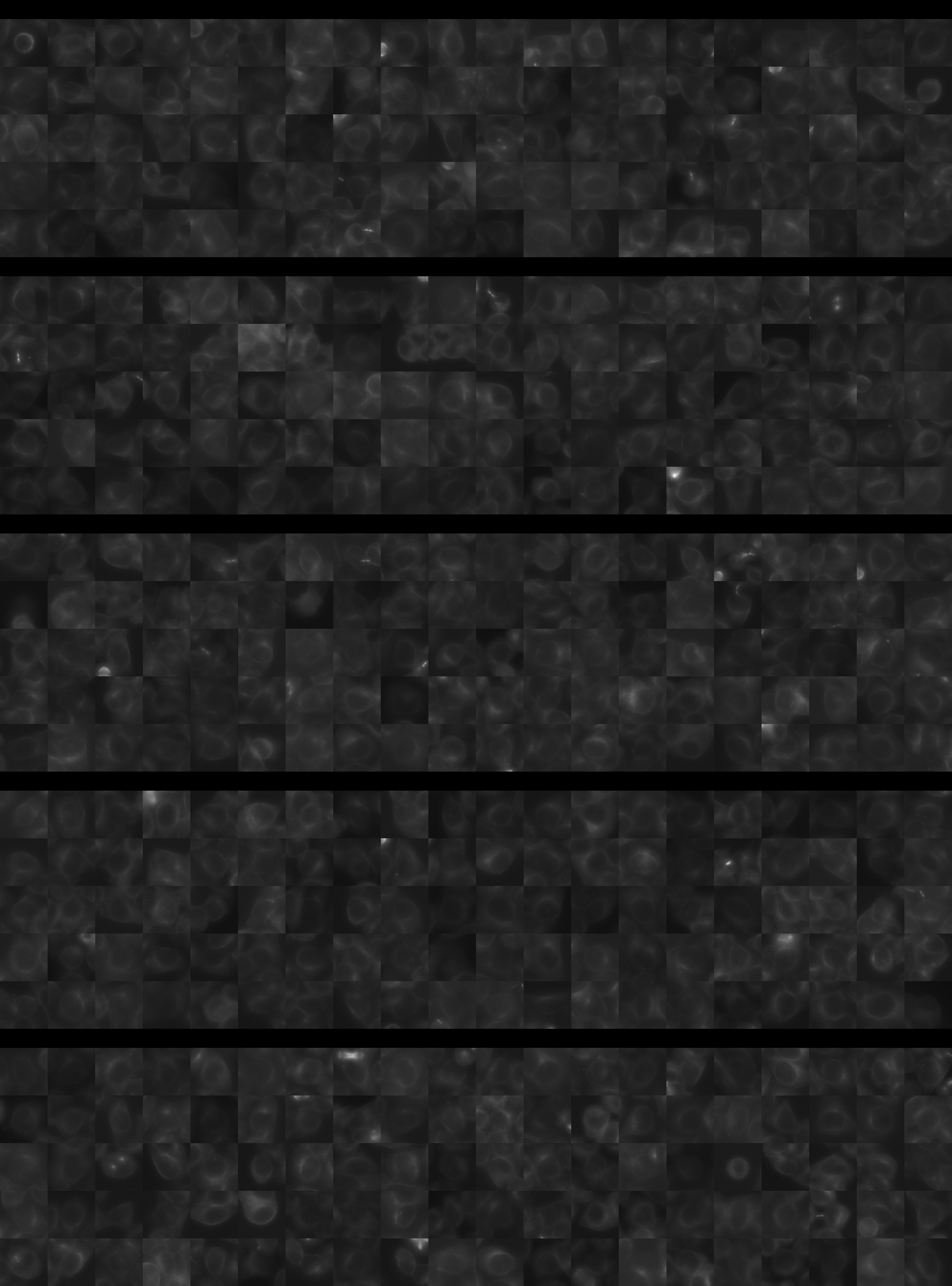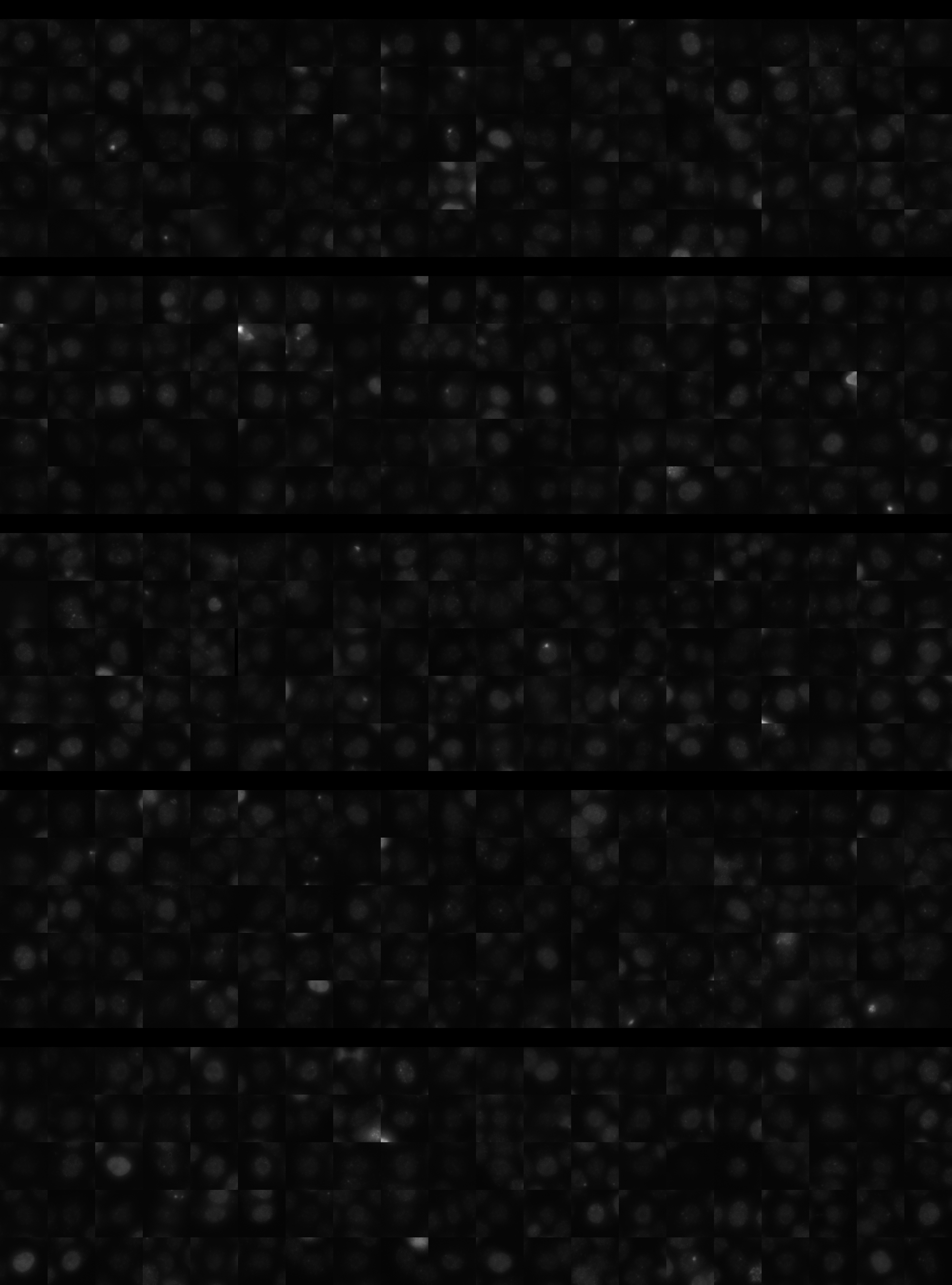 Each montage below shows randomly selected individual cell images for the same target gene separated by sgRNA, along with an example montage of cells expressing a non-targeting negative control sgRNA at the bottom. sgRNA labels in the montages correspond to the numbered sgRNA sequences in the gene info table above. The DNA (blue) and tubulin (green) channels are displayed by default, with gH2AX (grayscale) and actin (yellow) available using the check boxes. Channel brightness, contrast, and opacity are adjustable by clicking the arrow next to the channel name. When only one channel is selected, the display defaults to grayscale. Click the “Zoom” checkbox above the channel controls to enable image zooming (via scrolling) and panning (via click-and-drag).