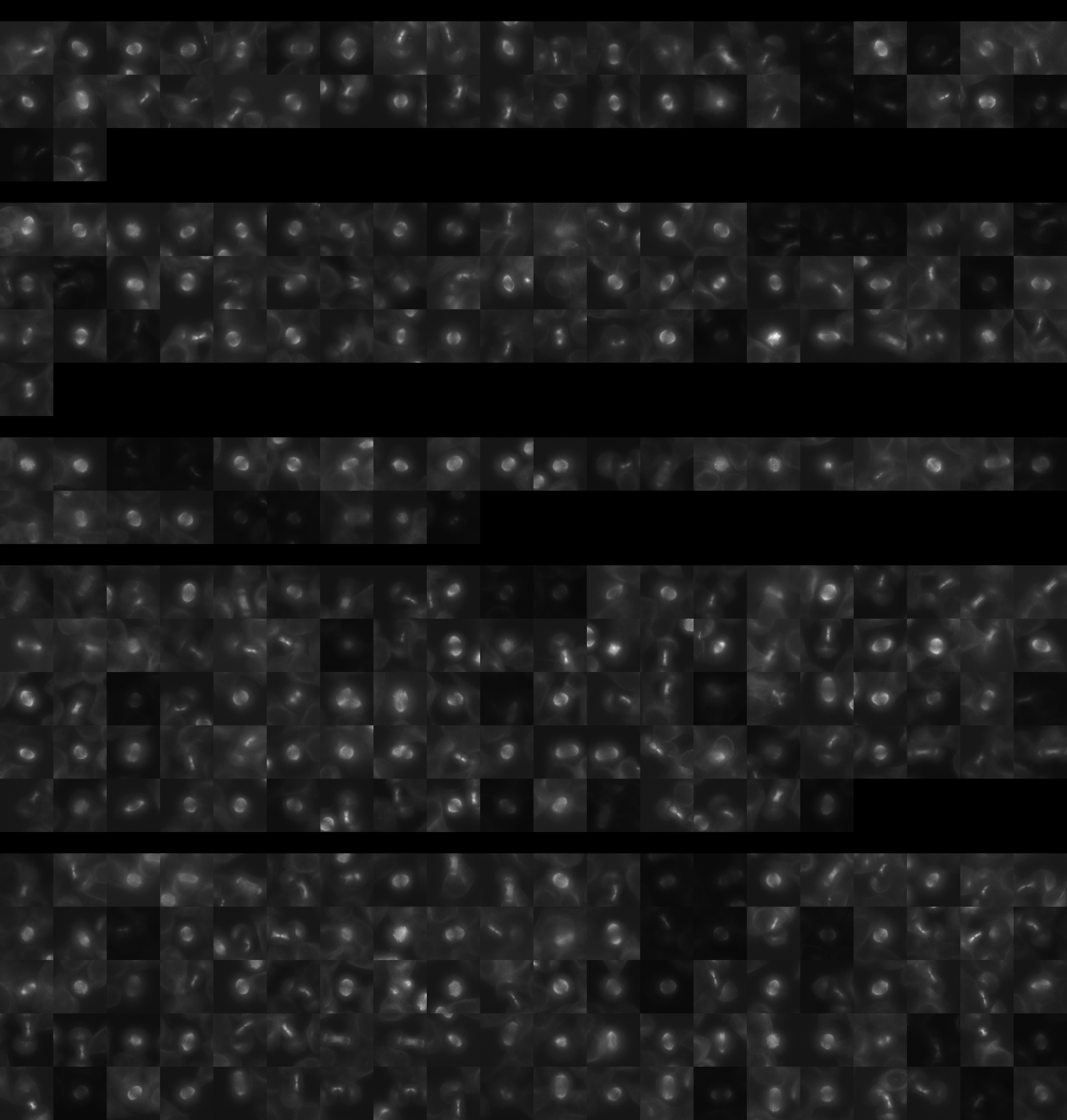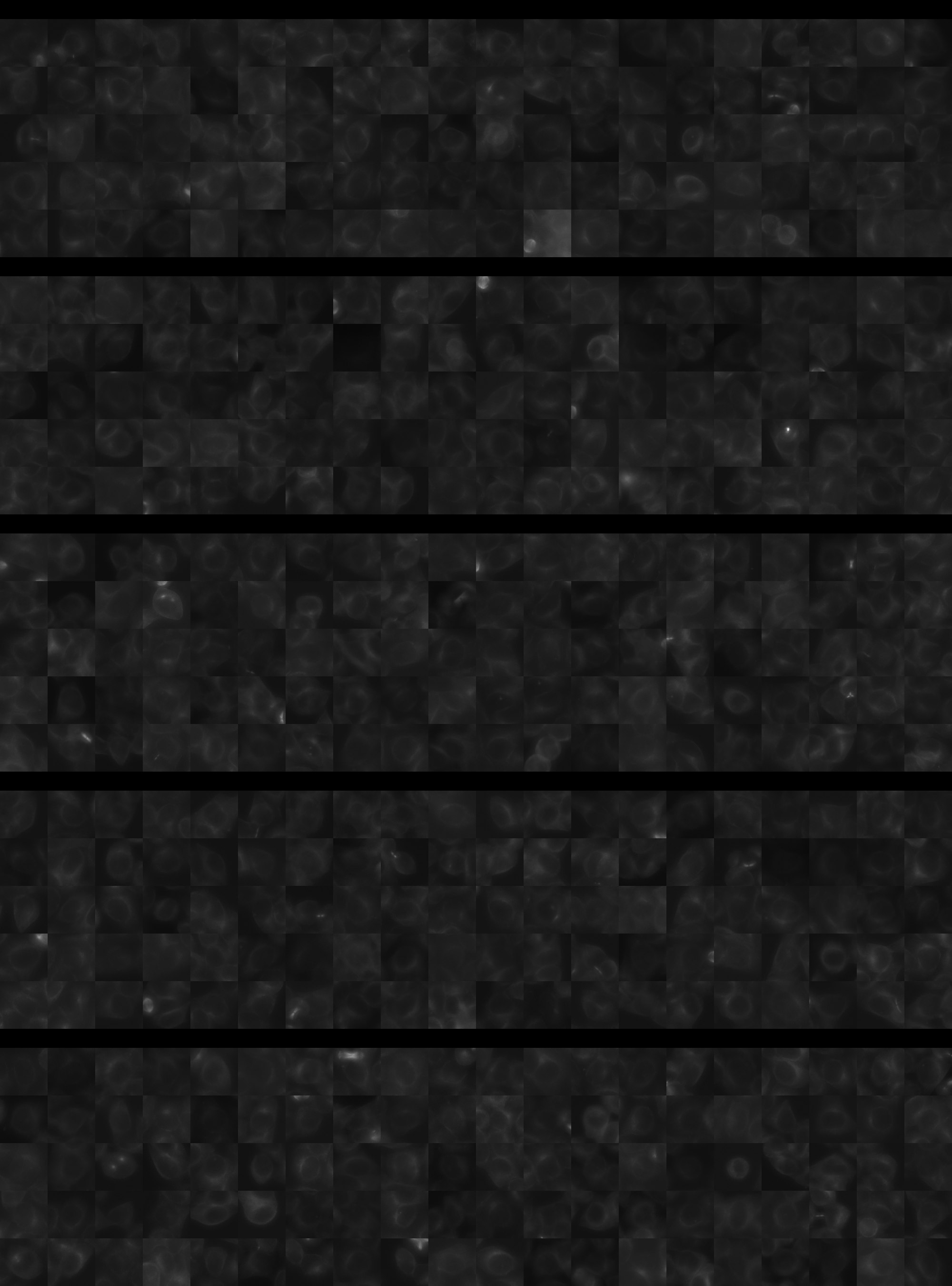 Each montage below shows randomly selected individual cell images for the same target gene separated by sgRNA, along with an example montage of cells expressing a non-targeting negative control sgRNA at the bottom. sgRNA labels in the montages correspond to the numbered sgRNA sequences in the gene info table above. The DNA (blue) and tubulin (green) channels are displayed by default, with gH2AX (grayscale) and actin (yellow) available using the check boxes. Channel brightness, contrast, and opacity are adjustable by clicking the arrow next to the channel name. When only one channel is selected, the display defaults to grayscale. Click the “Zoom” checkbox above the channel controls to enable image zooming (via scrolling) and panning (via click-and-drag).