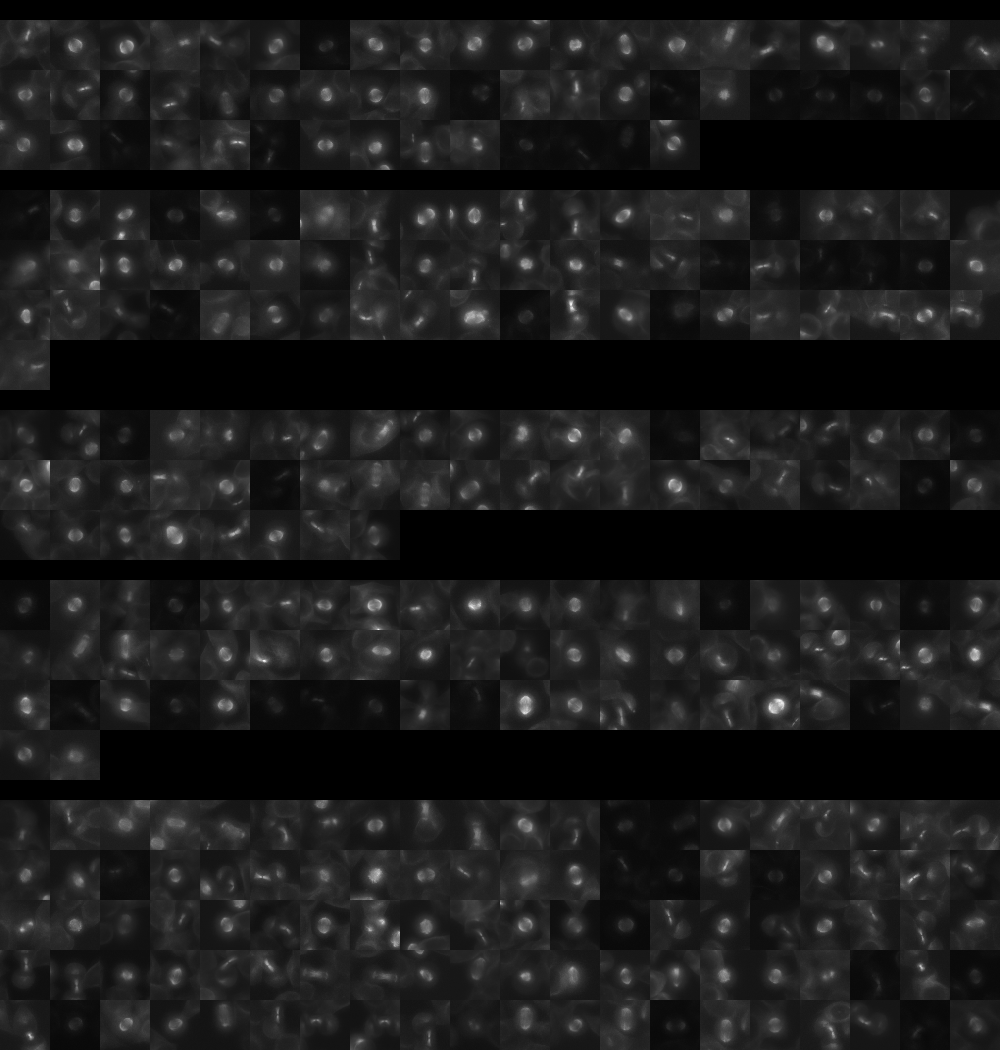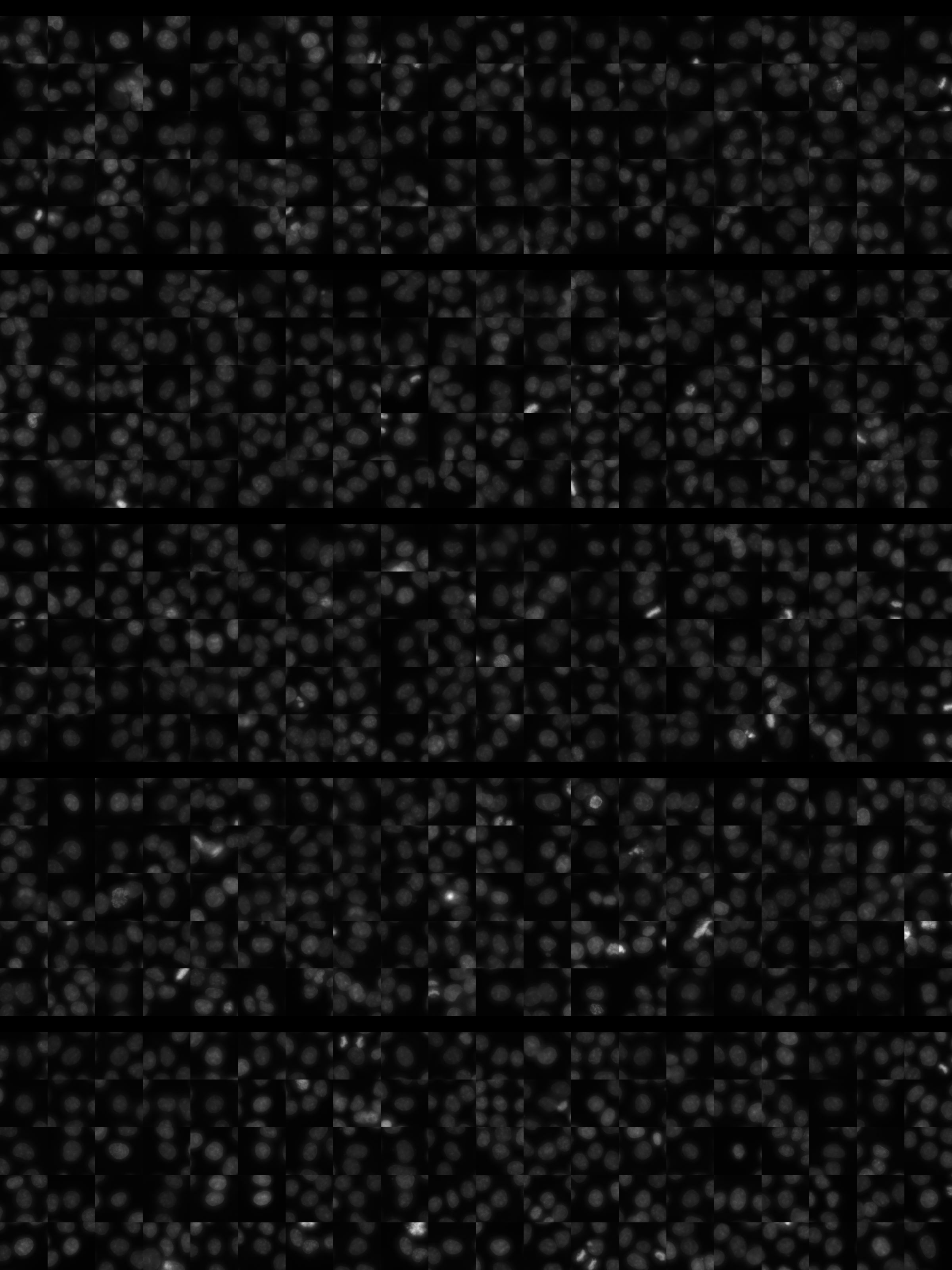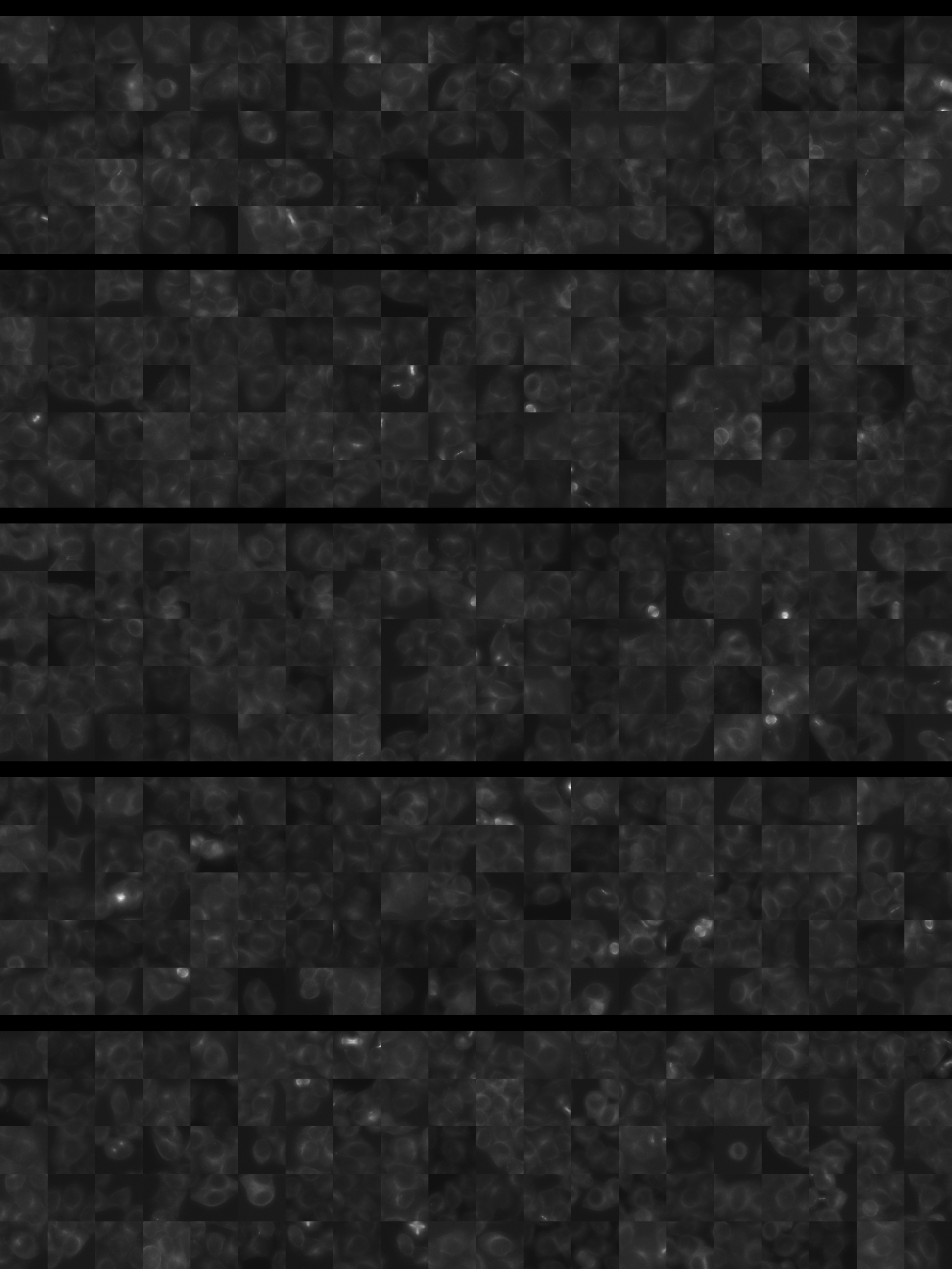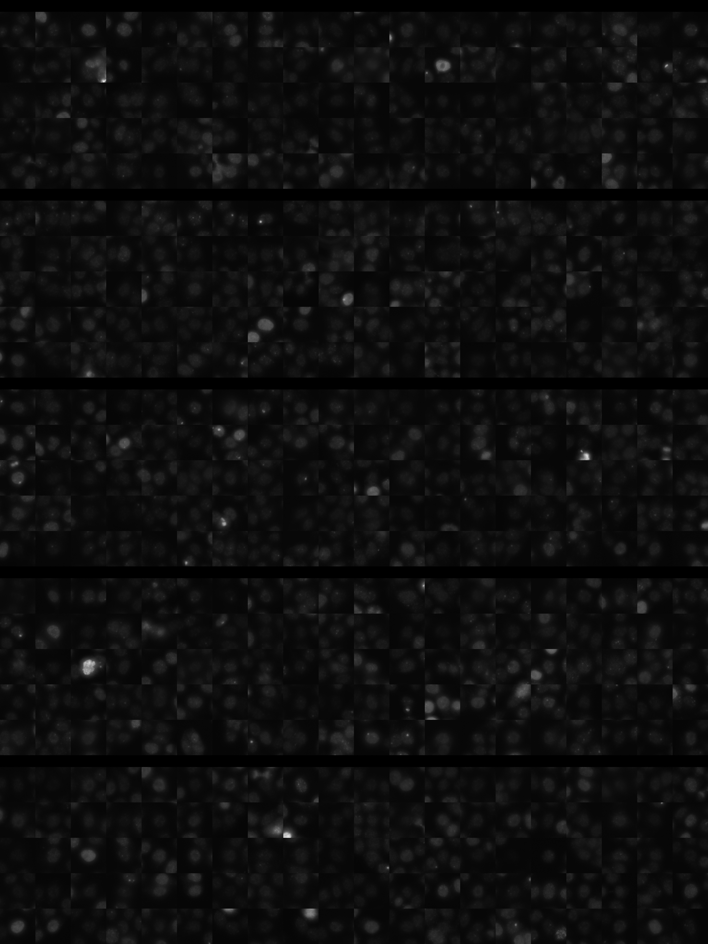 Each montage below shows randomly selected individual cell images for the same target gene separated by sgRNA, along with an example montage of cells expressing a non-targeting negative control sgRNA at the bottom. sgRNA labels in the montages correspond to the numbered sgRNA sequences in the gene info table above. The DNA (blue) and tubulin (green) channels are displayed by default, with gH2AX (grayscale) and actin (yellow) available using the check boxes. Channel brightness, contrast, and opacity are adjustable by clicking the arrow next to the channel name. When only one channel is selected, the display defaults to grayscale. Click the “Zoom” checkbox above the channel controls to enable image zooming (via scrolling) and panning (via click-and-drag).