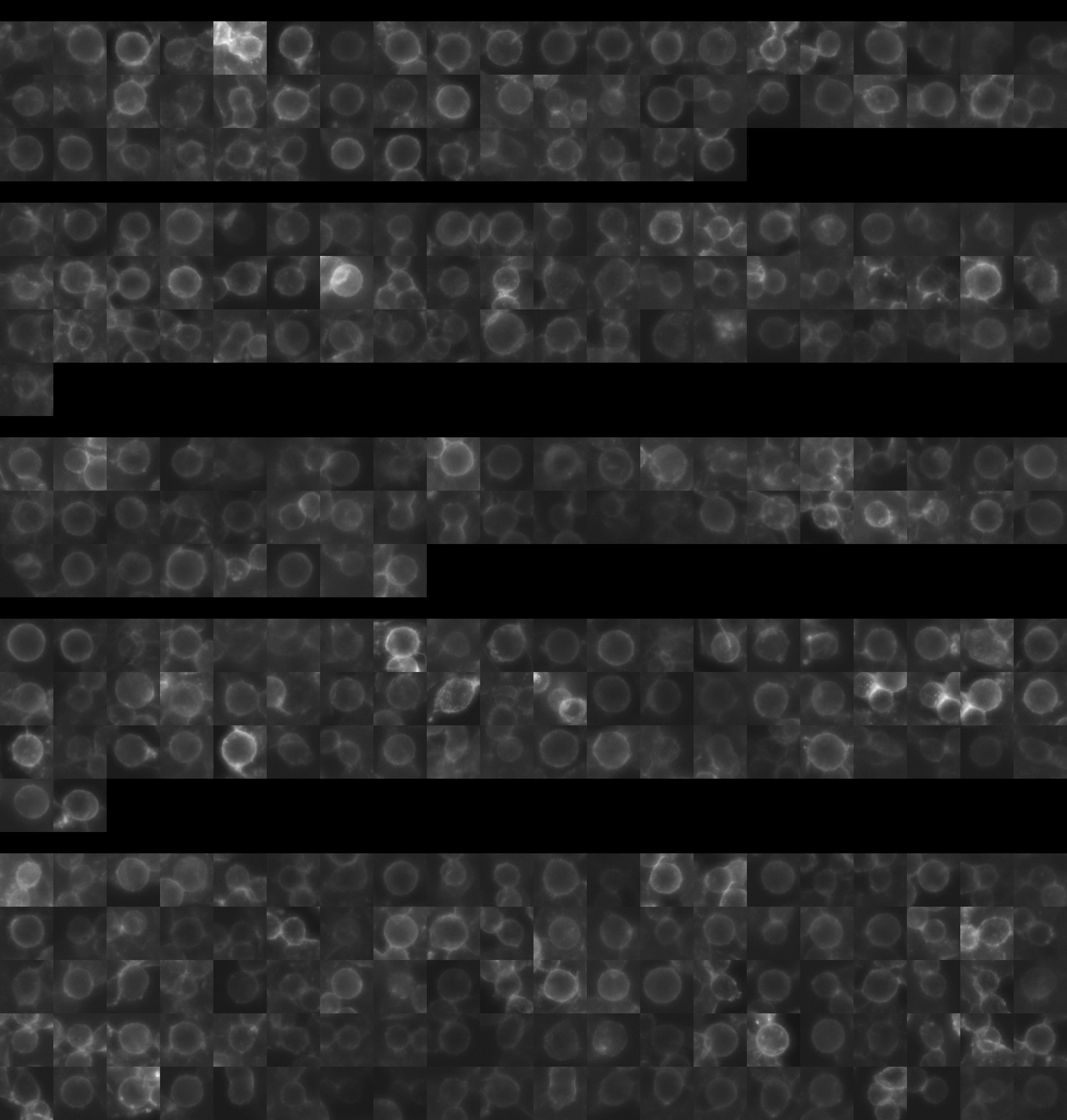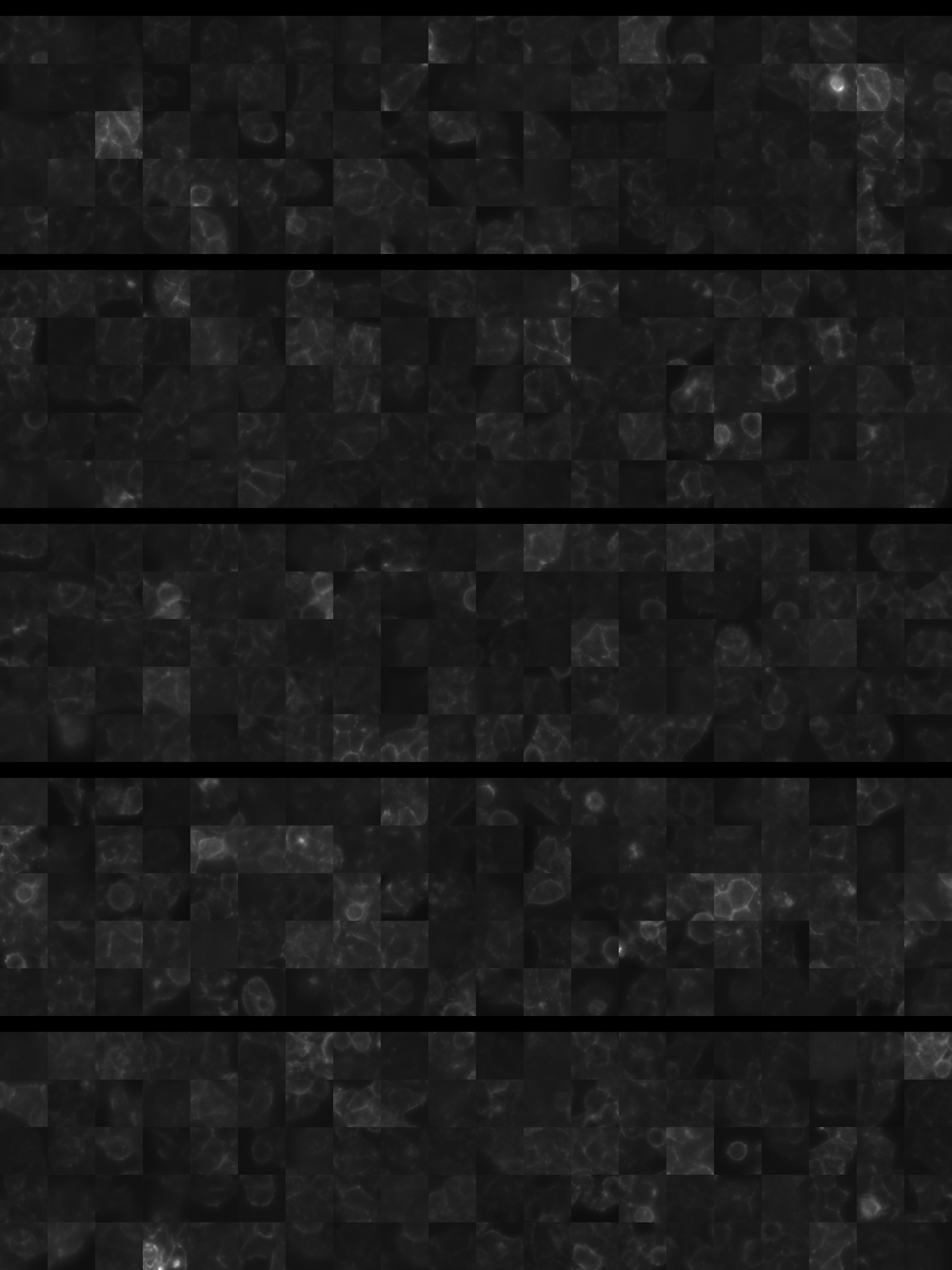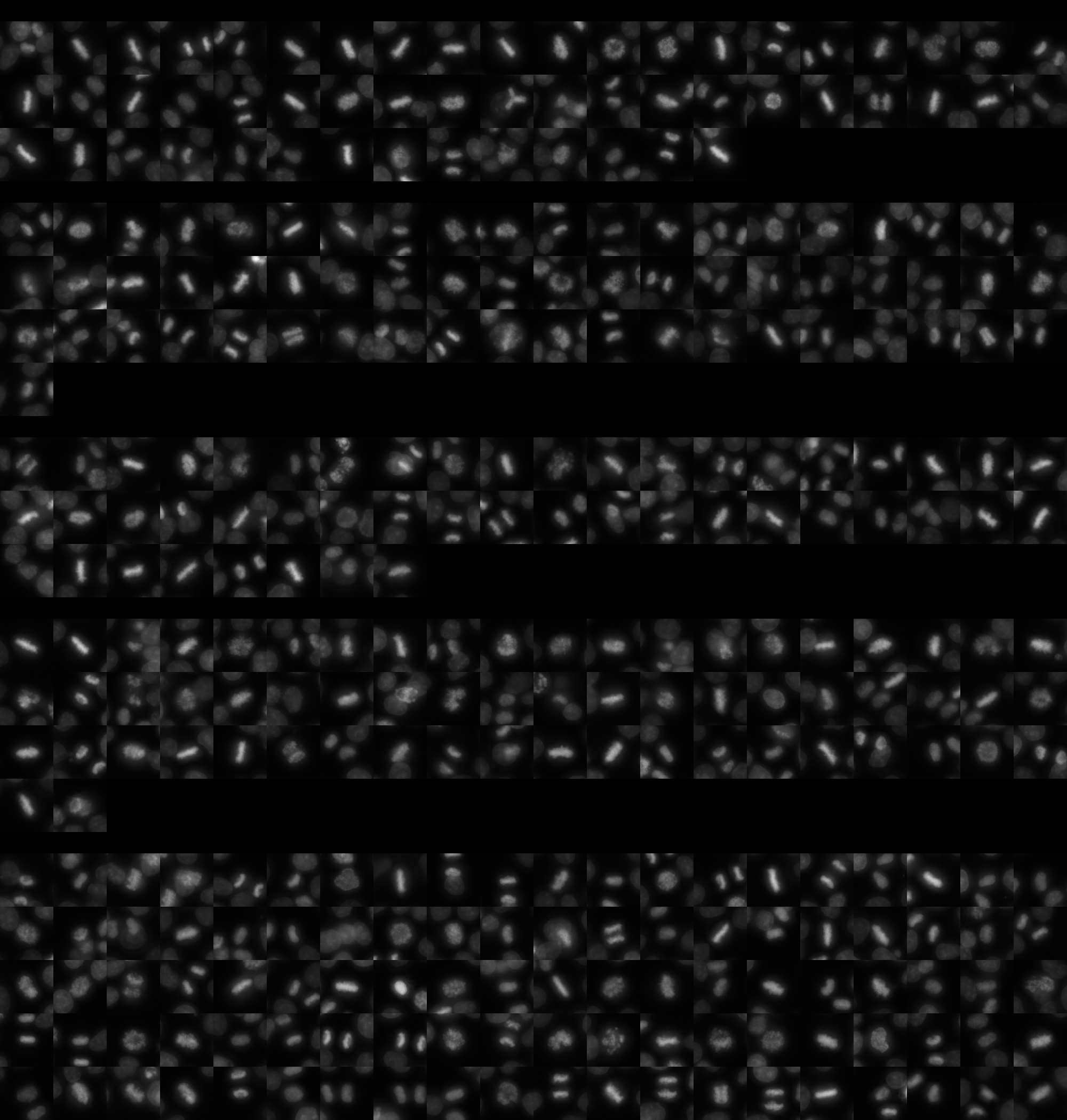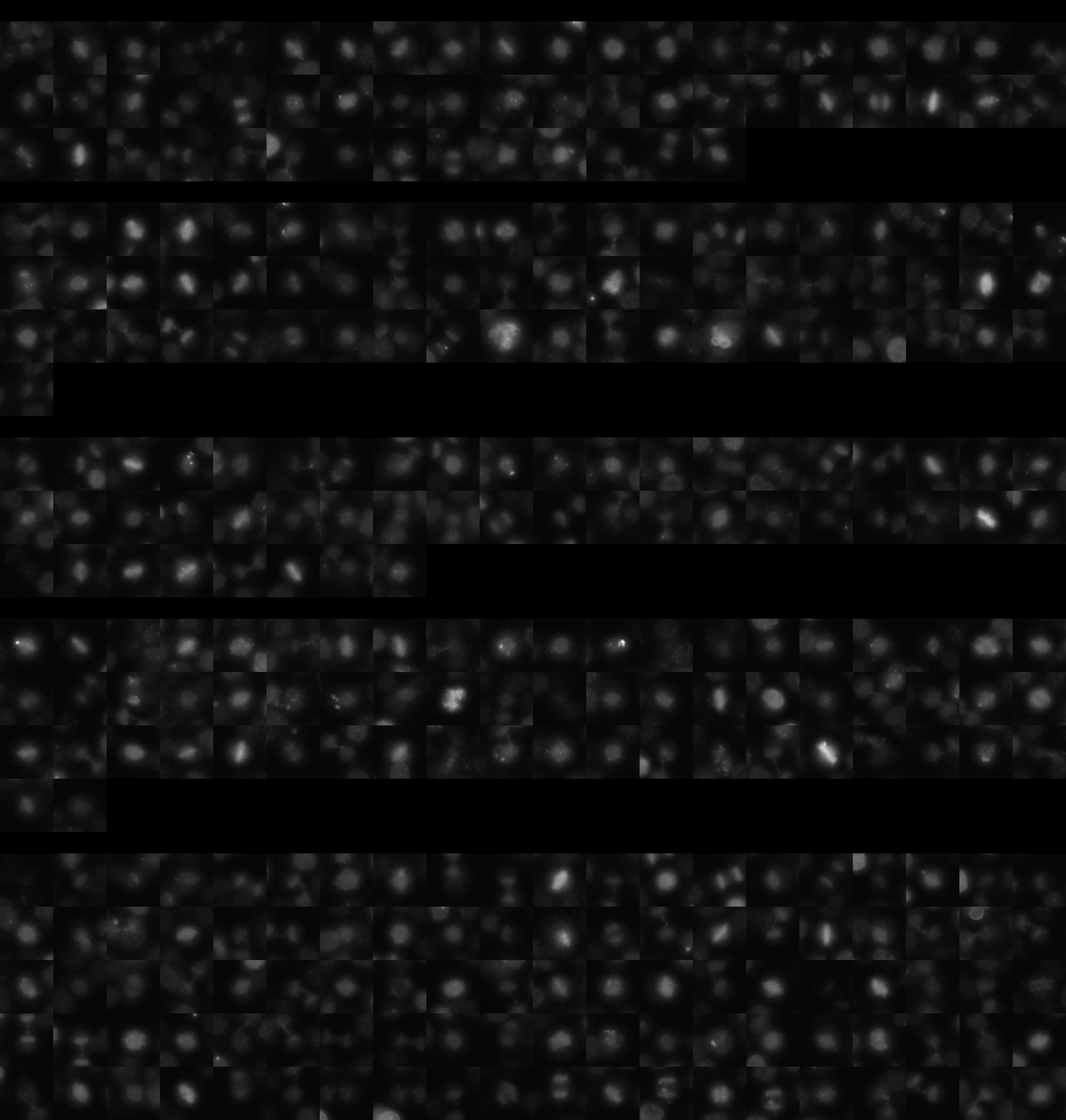 Each montage below shows randomly selected individual cell images for the same target gene separated by sgRNA, along with an example montage of cells expressing a non-targeting negative control sgRNA at the bottom. sgRNA labels in the montages correspond to the numbered sgRNA sequences in the gene info table above. The DNA (blue) and tubulin (green) channels are displayed by default, with gH2AX (grayscale) and actin (yellow) available using the check boxes. Channel brightness, contrast, and opacity are adjustable by clicking the arrow next to the channel name. When only one channel is selected, the display defaults to grayscale. Click the “Zoom” checkbox above the channel controls to enable image zooming (via scrolling) and panning (via click-and-drag).