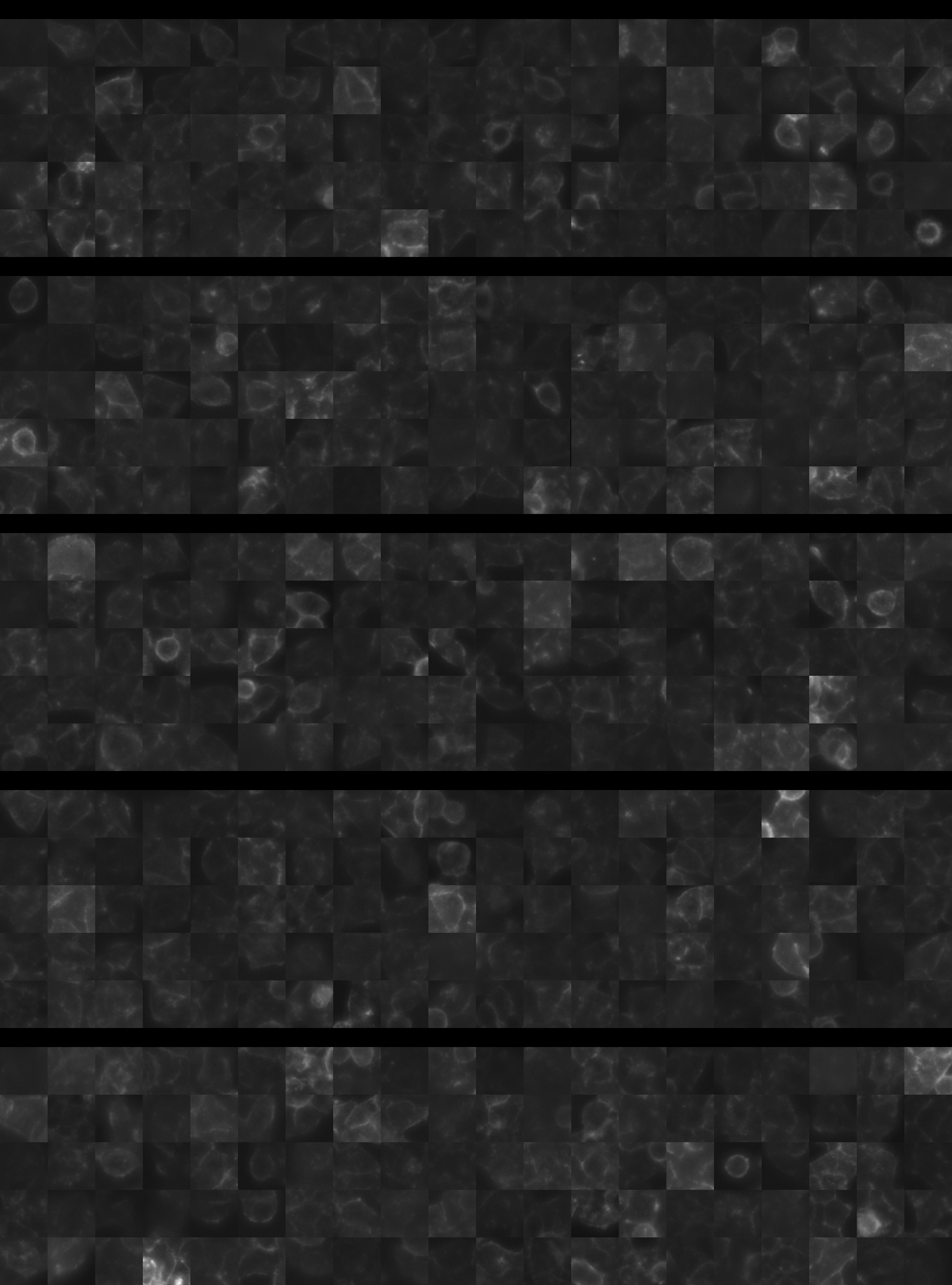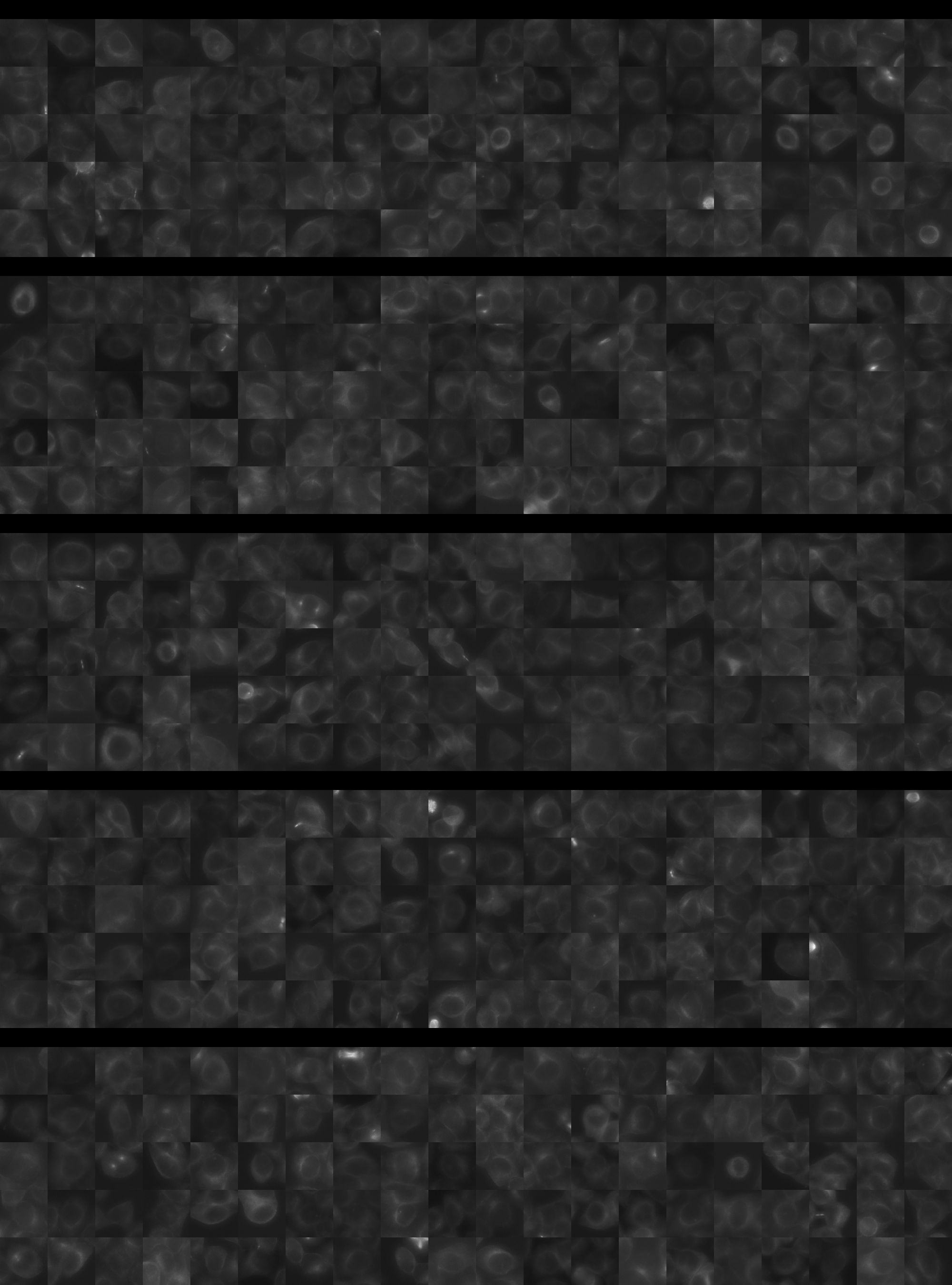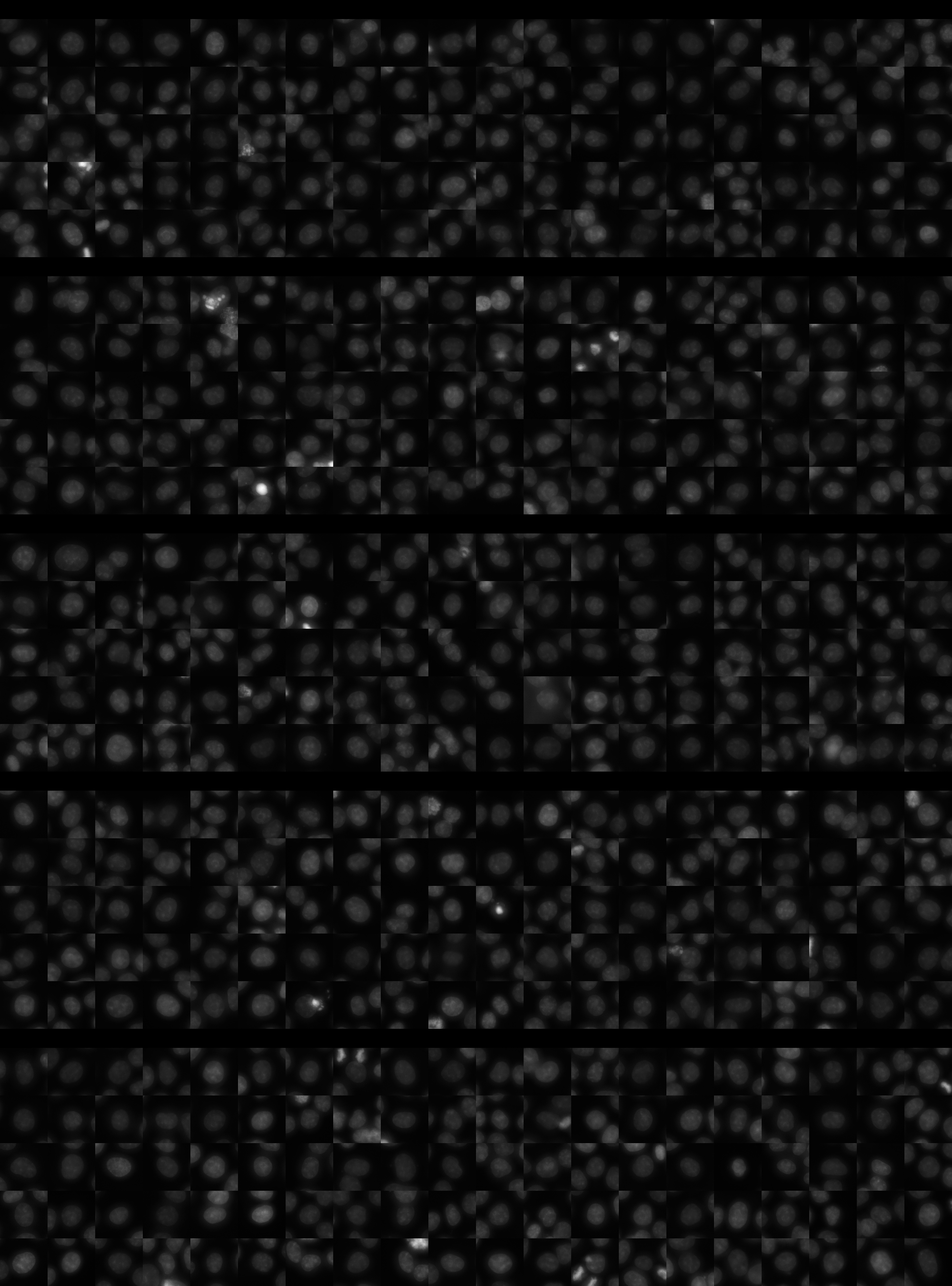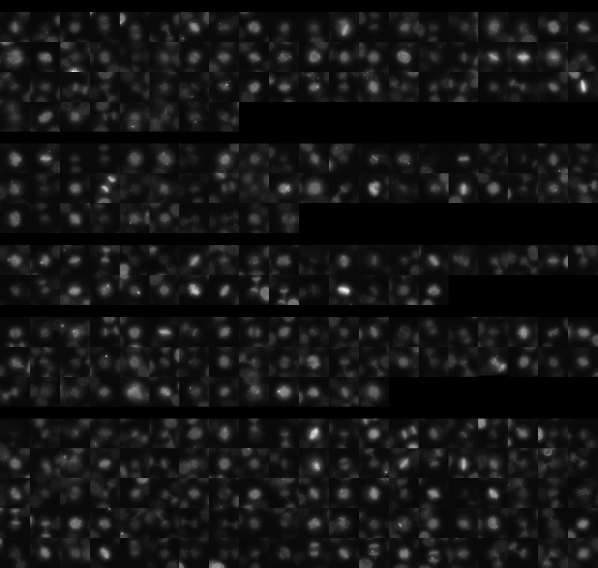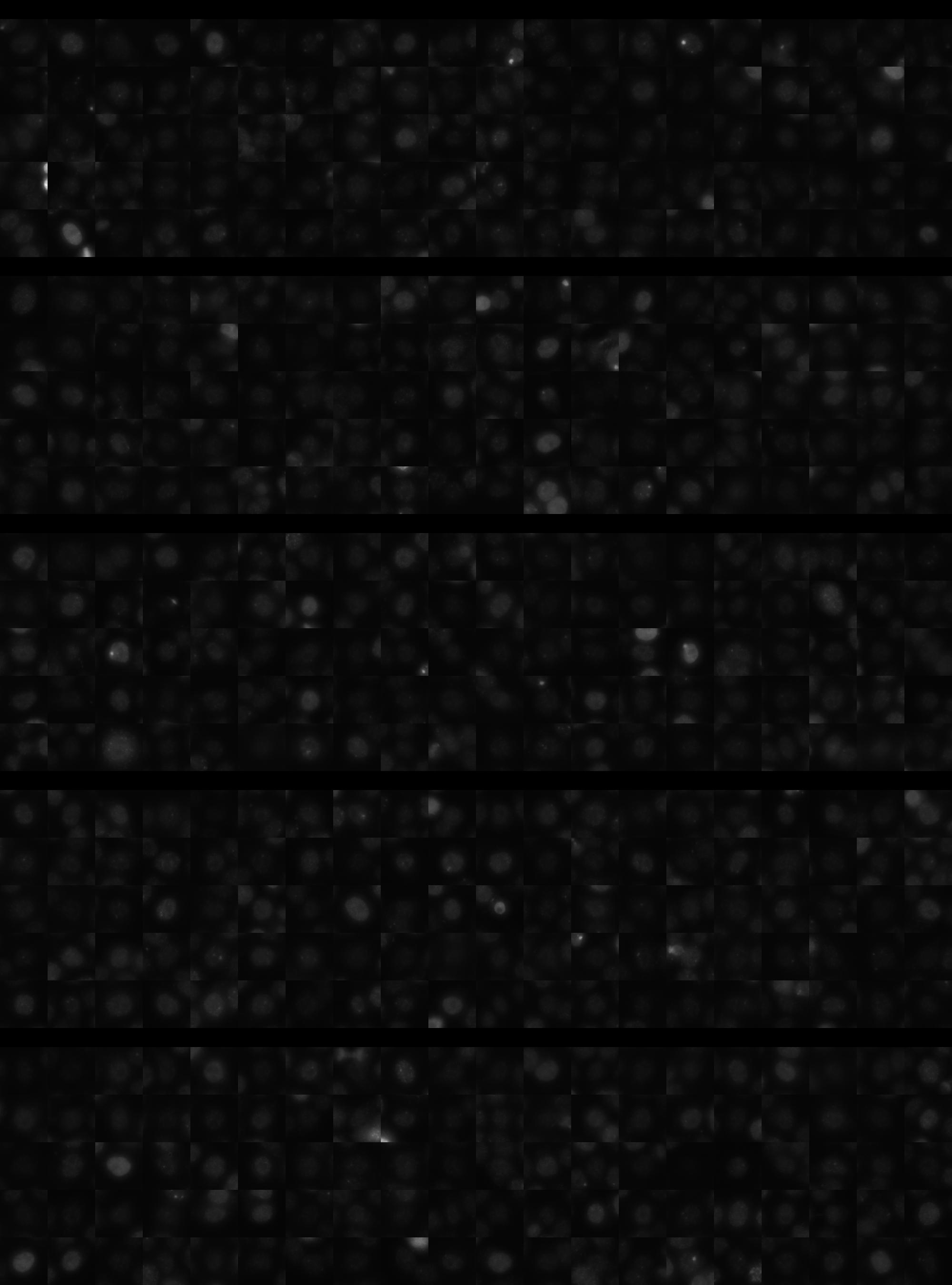 Each montage below shows randomly selected individual cell images for the same target gene separated by sgRNA, along with an example montage of cells expressing a non-targeting negative control sgRNA at the bottom. sgRNA labels in the montages correspond to the numbered sgRNA sequences in the gene info table above. The DNA (blue) and tubulin (green) channels are displayed by default, with gH2AX (grayscale) and actin (yellow) available using the check boxes. Channel brightness, contrast, and opacity are adjustable by clicking the arrow next to the channel name. When only one channel is selected, the display defaults to grayscale. Click the “Zoom” checkbox above the channel controls to enable image zooming (via scrolling) and panning (via click-and-drag).
