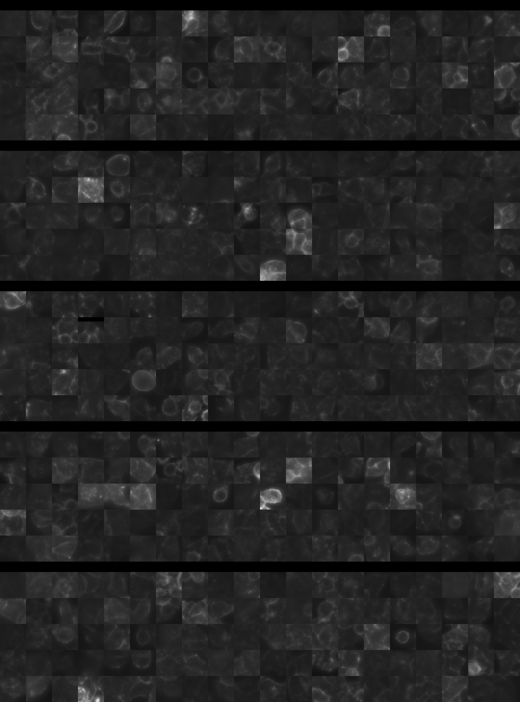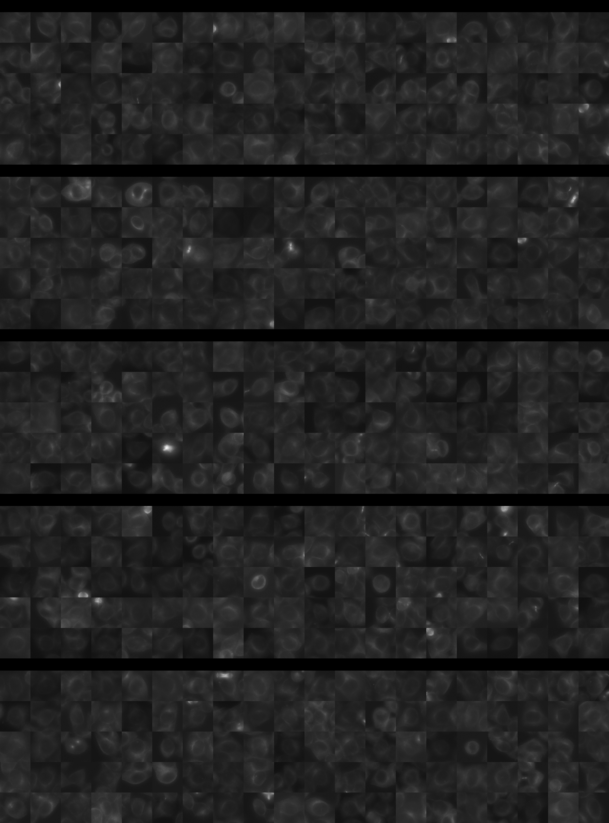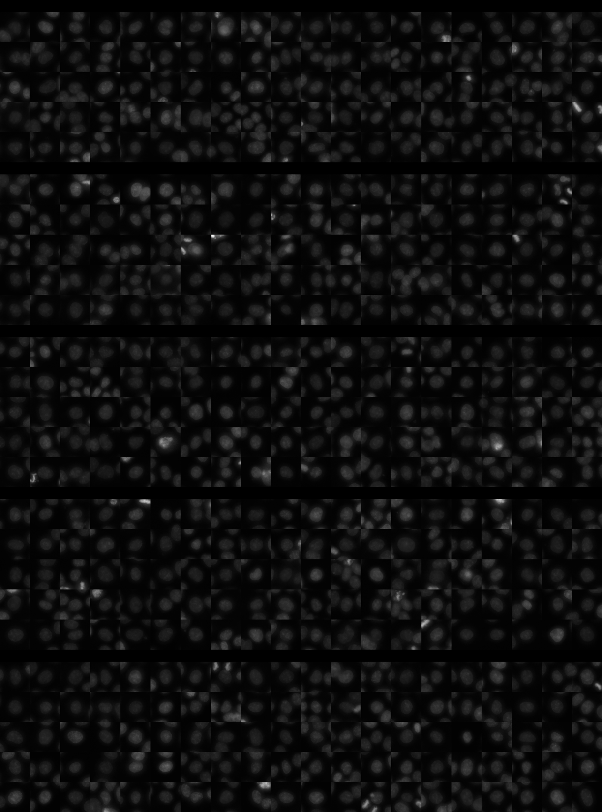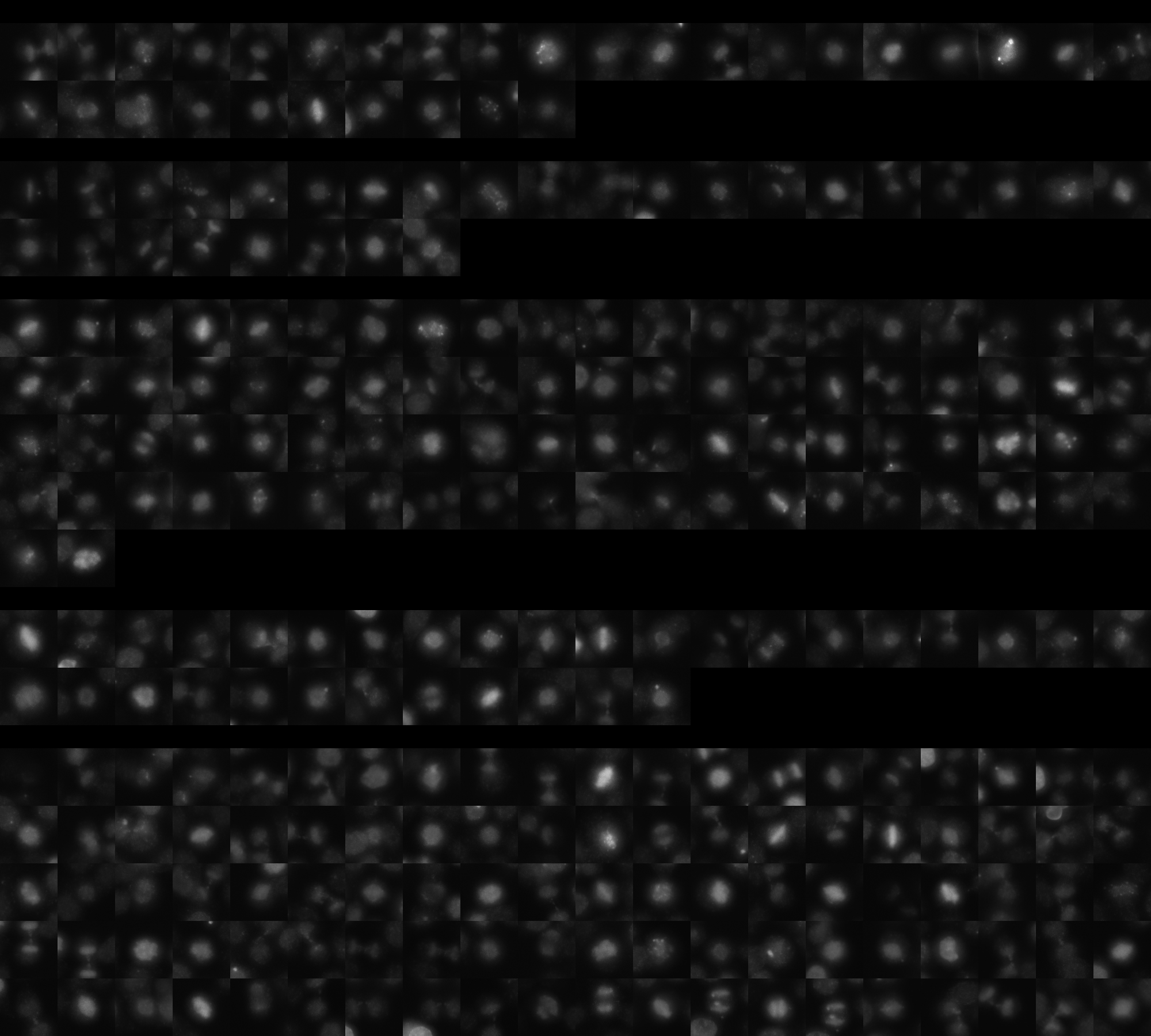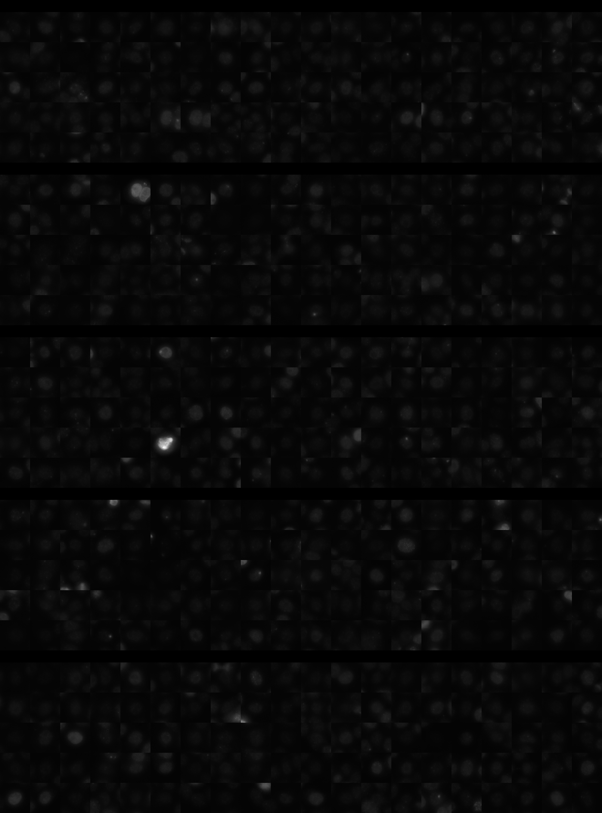 Each montage below shows randomly selected individual cell images for the same target gene separated by sgRNA, along with an example montage of cells expressing a non-targeting negative control sgRNA at the bottom. sgRNA labels in the montages correspond to the numbered sgRNA sequences in the gene info table above. The DNA (blue) and tubulin (green) channels are displayed by default, with gH2AX (grayscale) and actin (yellow) available using the check boxes. Channel brightness, contrast, and opacity are adjustable by clicking the arrow next to the channel name. When only one channel is selected, the display defaults to grayscale. Click the “Zoom” checkbox above the channel controls to enable image zooming (via scrolling) and panning (via click-and-drag).